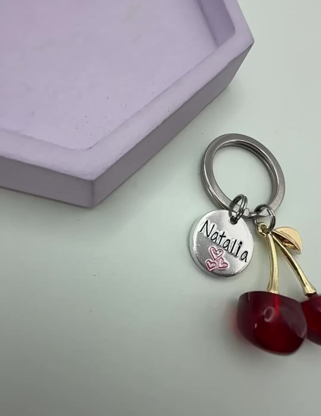 This cute keyring features a cherry charm paired with a personalised name disc, making it a playful yet practical accessory for your keys or bag. Perfect as a gift for friends, loved ones, or just a little treat for yourself - a small pop of fun and personality wherever you go!