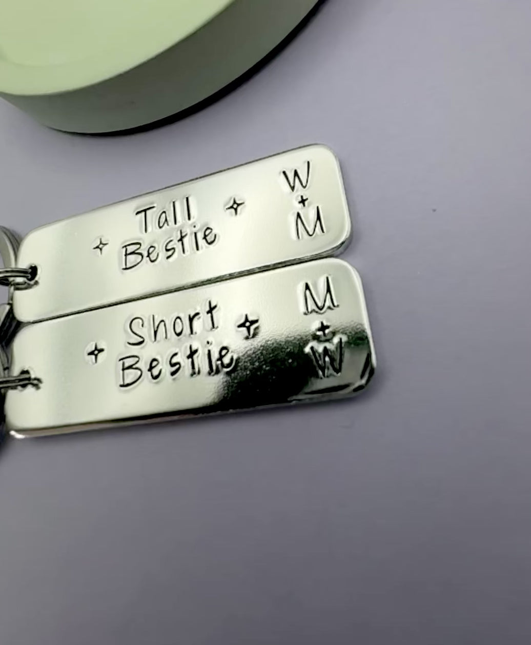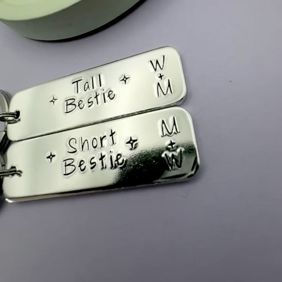 • Personalised, aluminium keyring set, one piece has "Short Bestie" the other has "Tall Bestie" on them. Each piece has two initials on them, we alternate the initials on each piece so please inform us of which order goes onto which piece please, i.e "Tall - W+M" and "Short - M+W" - if not order is left, we will do them the same on both pieces in the order that you leave the initials in the box.
