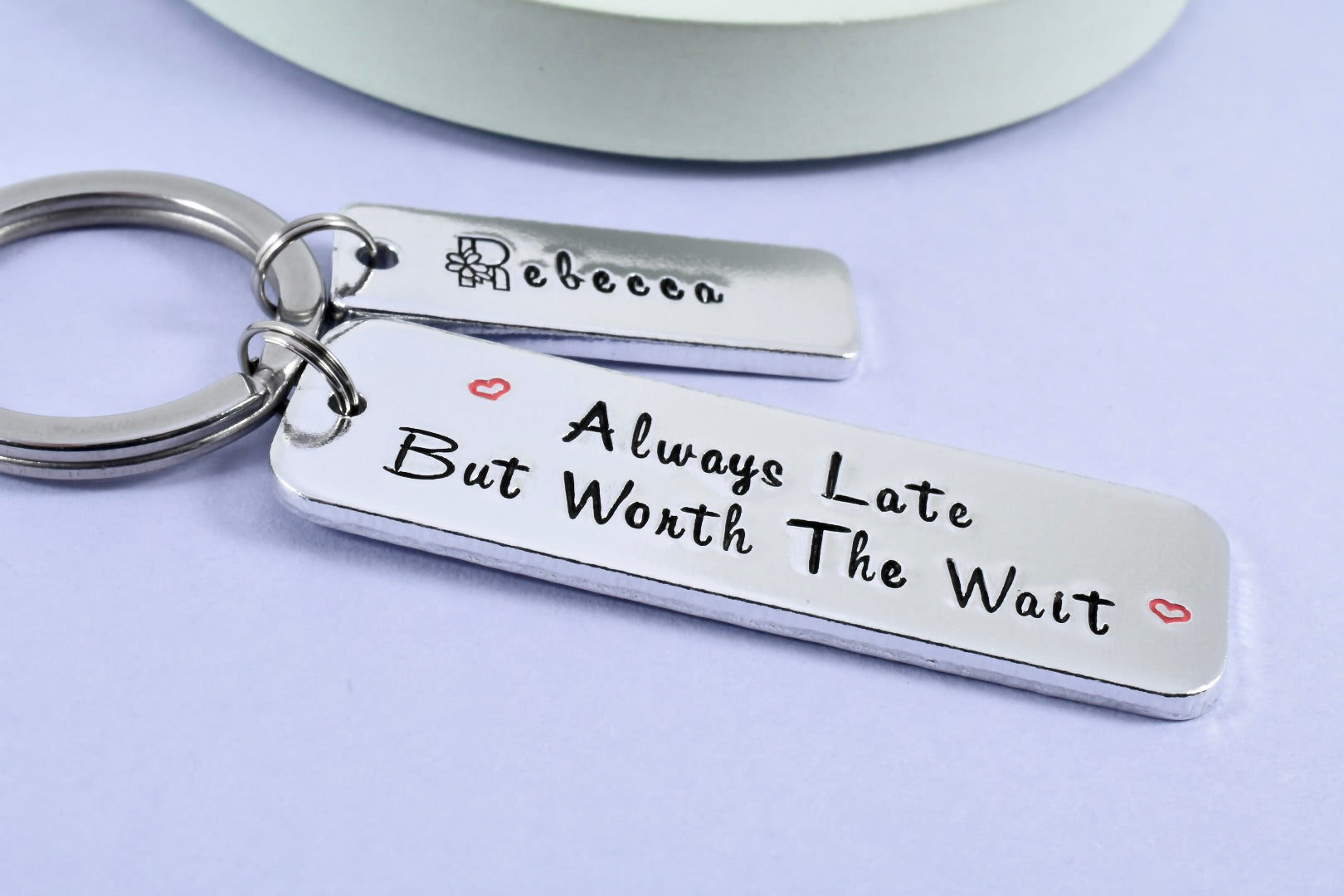 Personalised "Always Late But Worth The Wait" Keyring • Cheeky Gift For Tardy Friend • Someone That's Always Running Late • Funny Gift