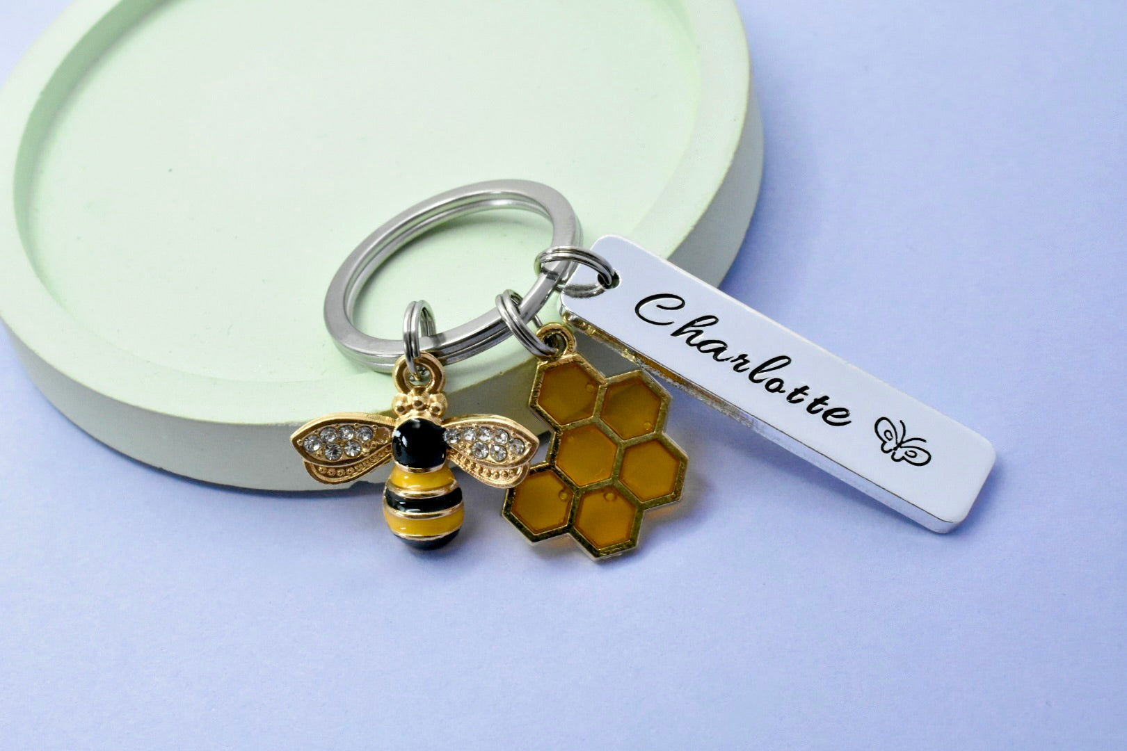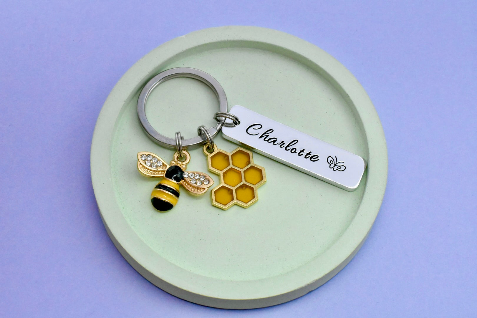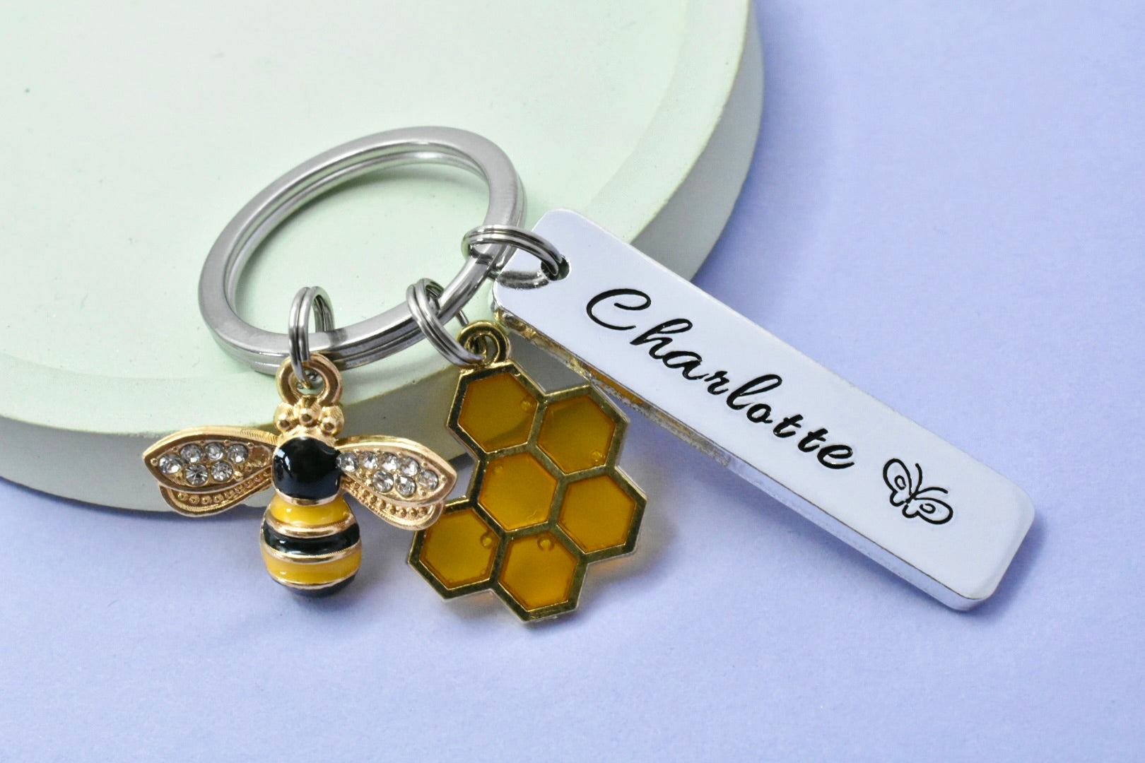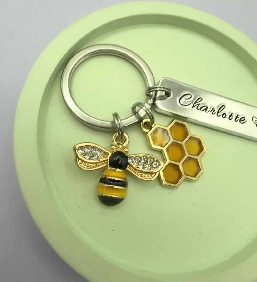 A charming handcrafted keyring featuring a sparkling bee, a warm golden honeycomb charm, and a personalised name tag. Perfect for birthdays, Mother’s Day, teacher appreciation, beekeeper gifts, or anyone who just loves bees!