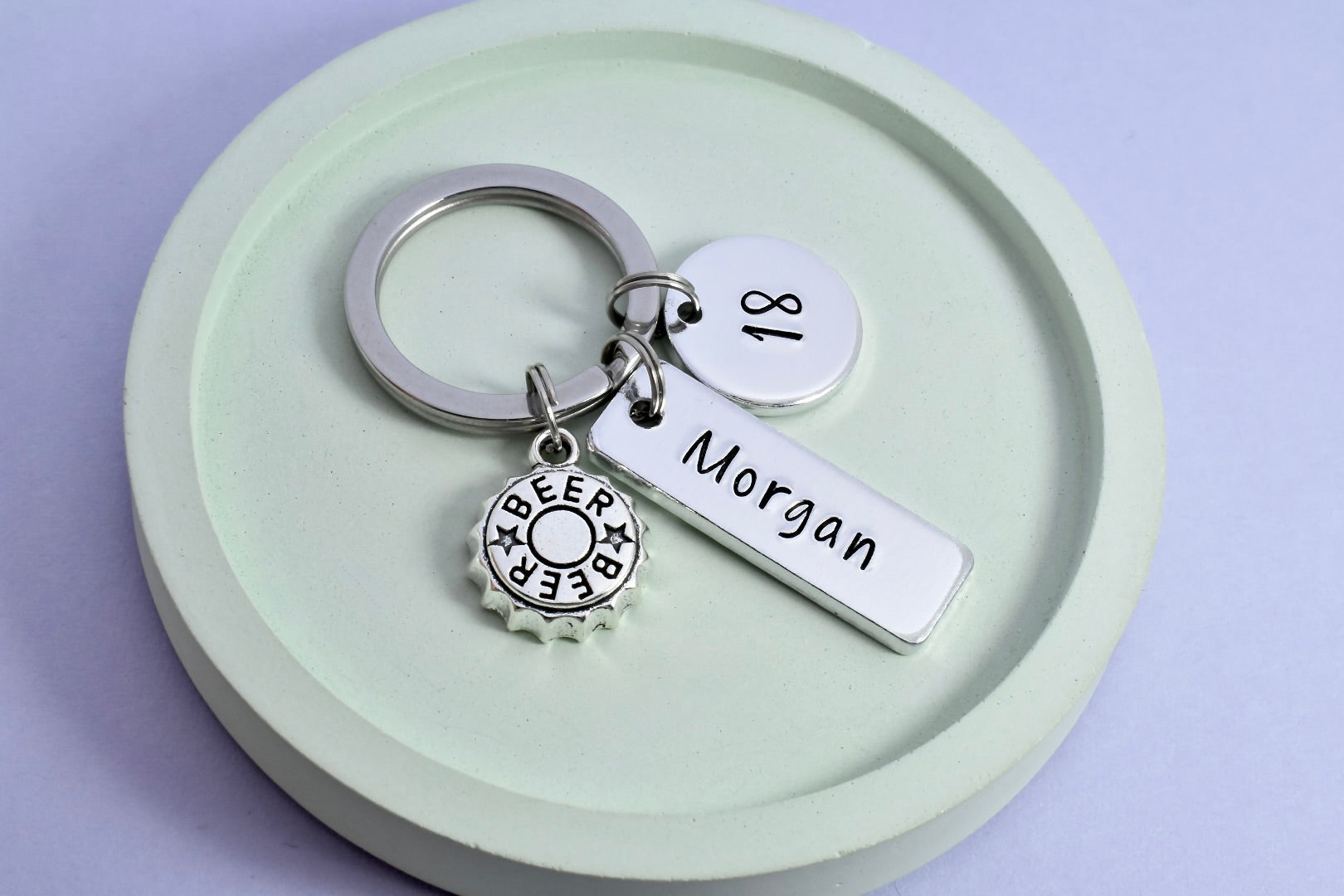 Personalised Birthday Keyring • 18th Key Ring • First Legal Drink Gift • Beer Cap Keyring • Gift For Him • Customised Name and Age • 21st