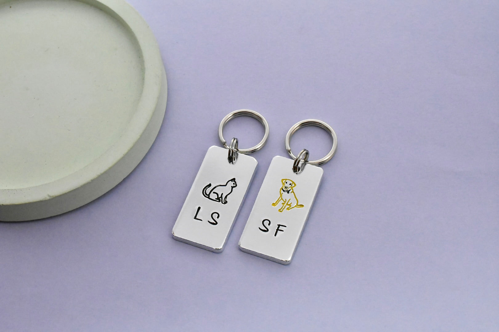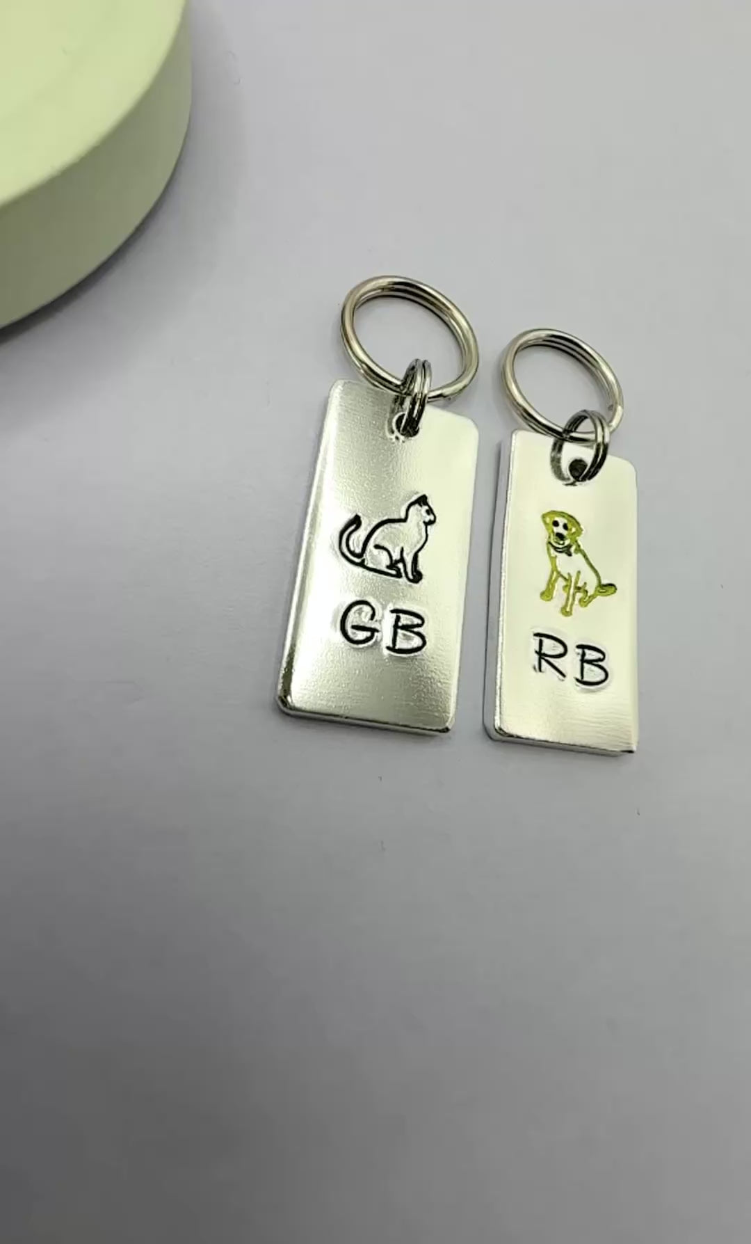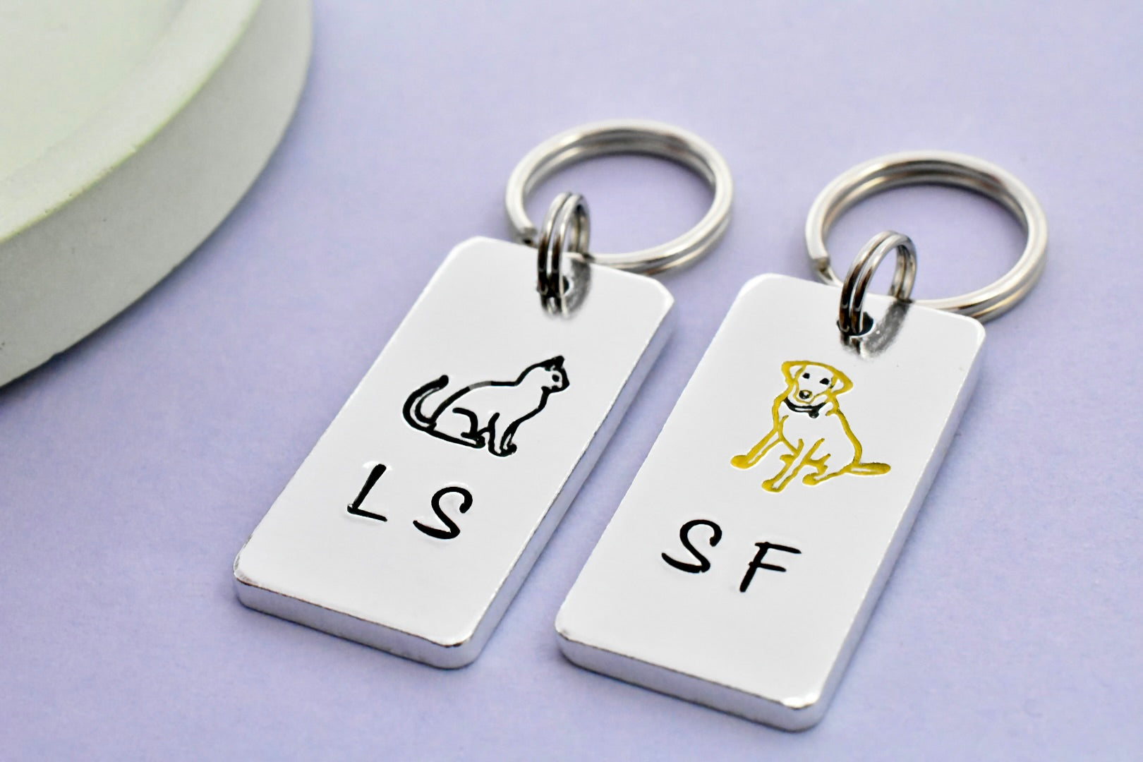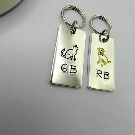 Each keyring can be personalised with 2-3 initials, with the black cat and yellow dog designs above each set of initials. Please specify which initials go on which keyring.
