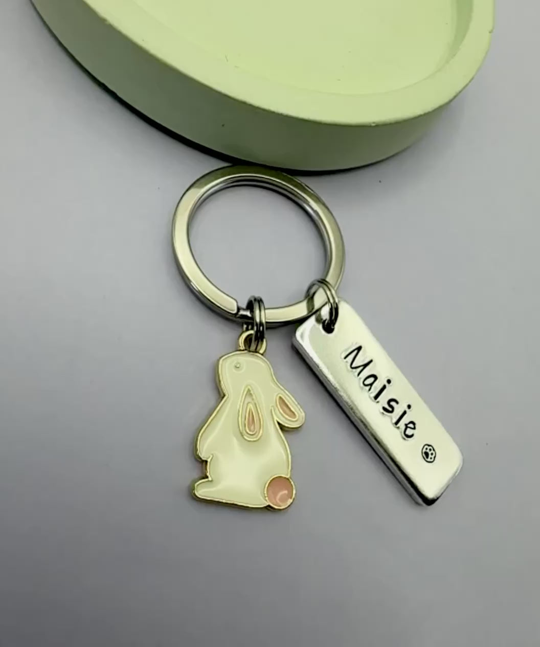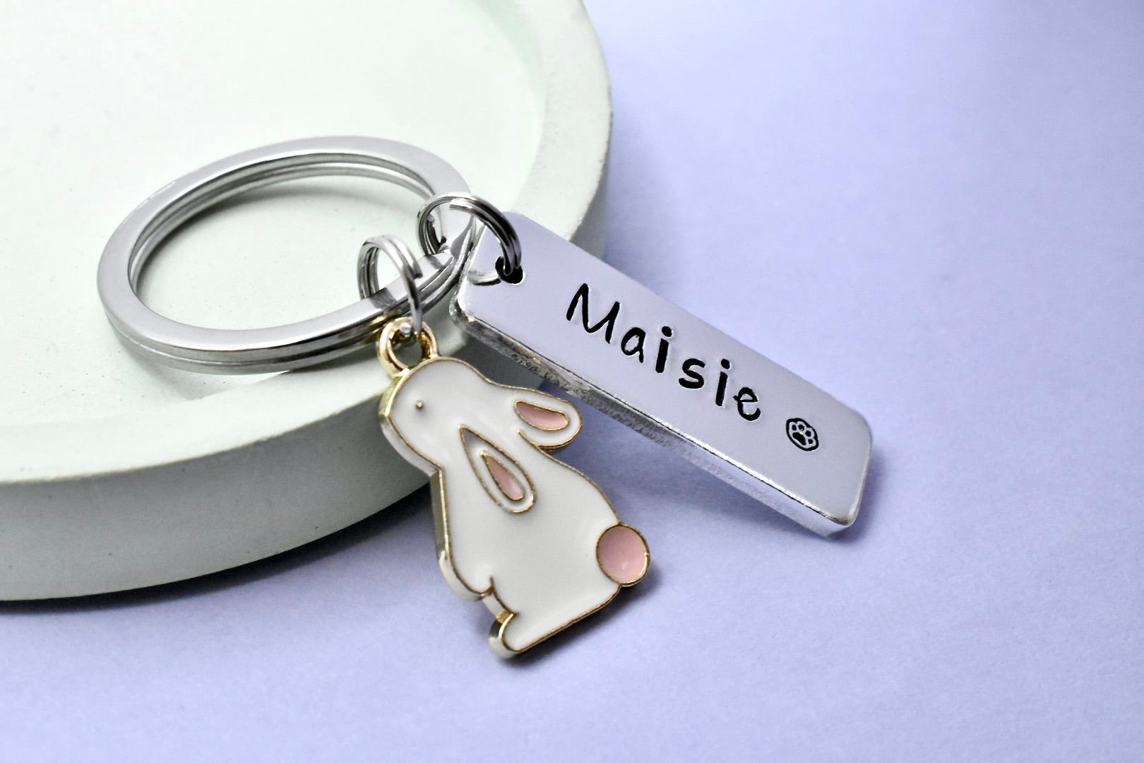 • Add a touch of cuteness to your keys or bag with this adorable personalised bunny keyring. Each one features a sweet enamel bunny charm paired with a hand-stamped metal tag personalised with a name of your choice and tiny paw print - making it the perfect gift for any bunny lover, Easter basket, birthdays, as a stocking filler etc.