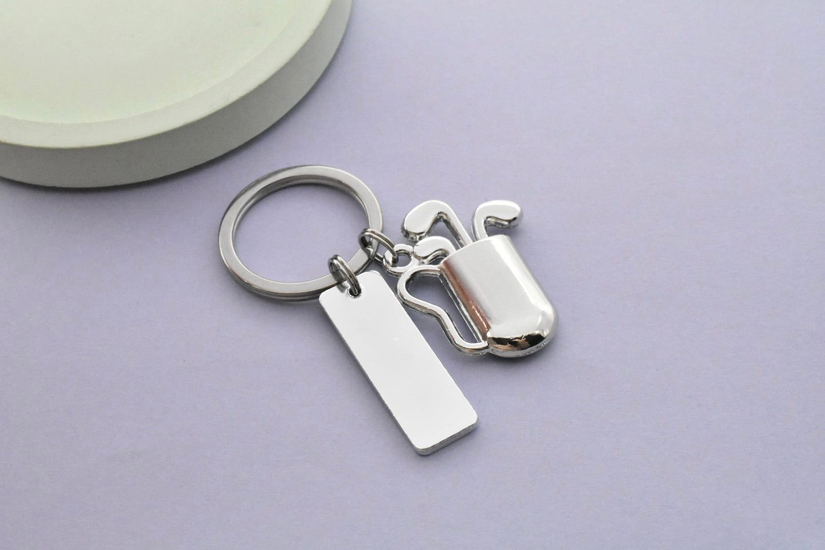 A stylish golf-inspired keyring, perfect for golf lovers of all ages. The aluminum rectangle is personalised with one name (only) and finished with a small golf ball on tee design, paired with a detailed blue golf bag charm for the perfect finishing touch.
