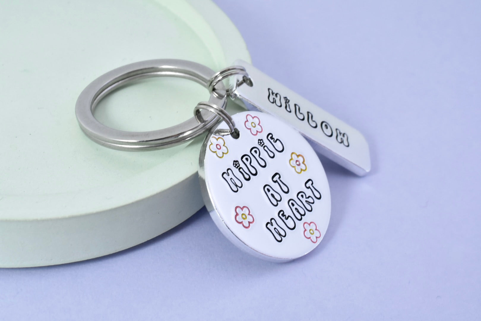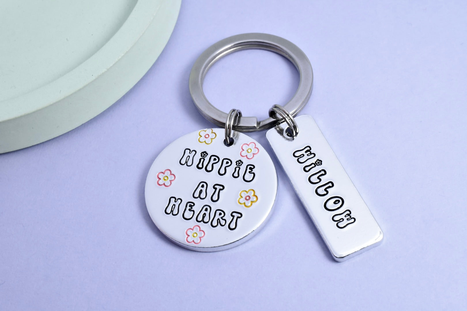 Personalised Hippie At Heart Keyring • Hippy Key Ring • Fan of the 60's • Cute Retro Gift • Boho Keychain • Hippie Vibes Gift