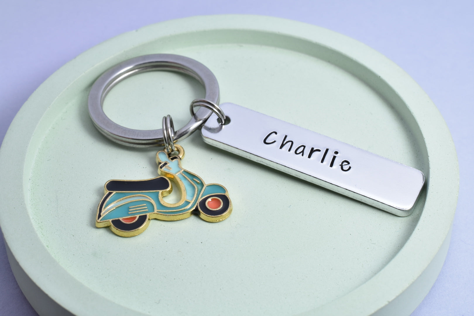 Personalised Moped Keyring • Scooter Key Ring • Personalised 'Ride Safe' Keychain • First Moped Gift • Passed CBT Test Gift • Bike Keyring